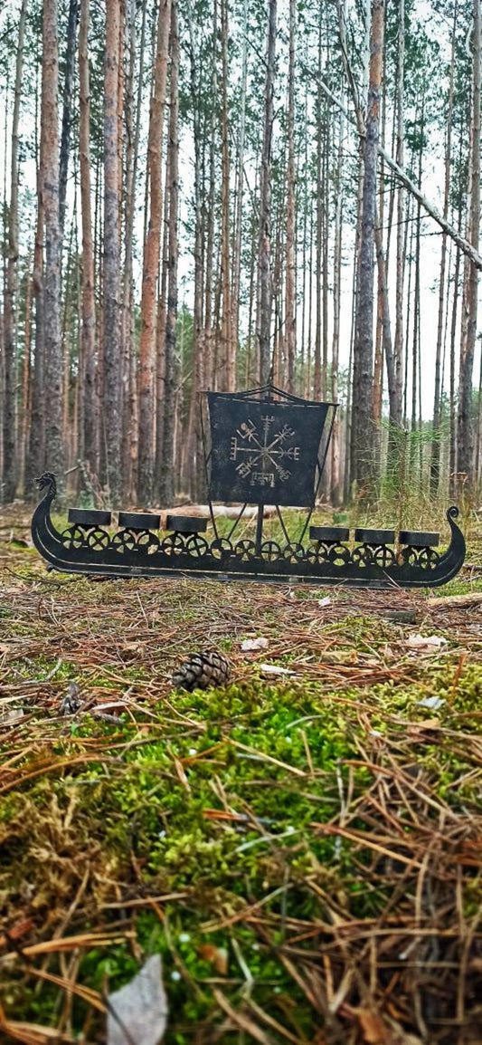 Large Drakkar Viking Ship Candleholder Vegvisir Norse Runes Nordic Asatru