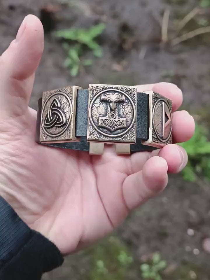 Experience the power of the Norse gods with this Viking leather wristband bracelet featuring Mjolnir, Thurisaz rune and triquetra charms. Handcrafted with premium quality leather, this wrist cuff is a perfect blend of Celtic and Viking style. The Mjolnir charm represents the mighty hammer of Thor, while the Thurisaz rune symbolizes strength and protection. The triquetra charm adds a touch of Celtic flair to this piece. Ideal for men who love Norse and Celtic jewelry, this leather arm band is perfect for everyday wear. Add this unique piece of leather goods to your collection of viking jewelry for an authentic and stylish look with ancient runes and motifs.